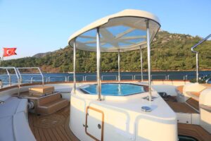 The upper deck skylounge provides the perfect space to relax or enjoy intimate gatherings, while the sundeck jacuzzi offers an unrivaled vantage point to take in the stunning Mediterranean scenery.