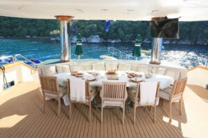 Relax in the expansive aft beach club with direct sea access, or enjoy the main deck salon and dining area, featuring stunning 360-degree panoramic views perfect for both relaxation and entertainment. The sophisticated party deck provides an ideal setting for unforgettable gatherings under the Mediterranean sun.