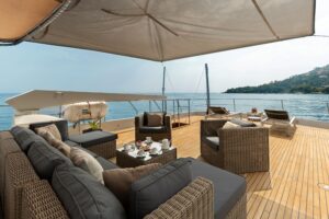 GITANES’s open deck offers breathtaking panoramic views that stretch across the sparkling sea, creating a sense of boundless freedom. Sunlight dances on the water, while gentle sea breezes enhance the serene and calming atmosphere, making it the perfect spot to unwind, sip a cocktail, or simply lose yourself in the beauty of the surroundings. Whether you’re enjoying a quiet moment of reflection or sharing laughter with friends, the deck provides an idyllic setting for relaxation and memorable experiences.