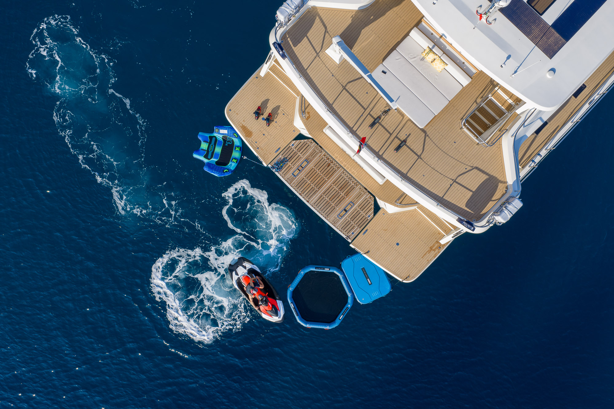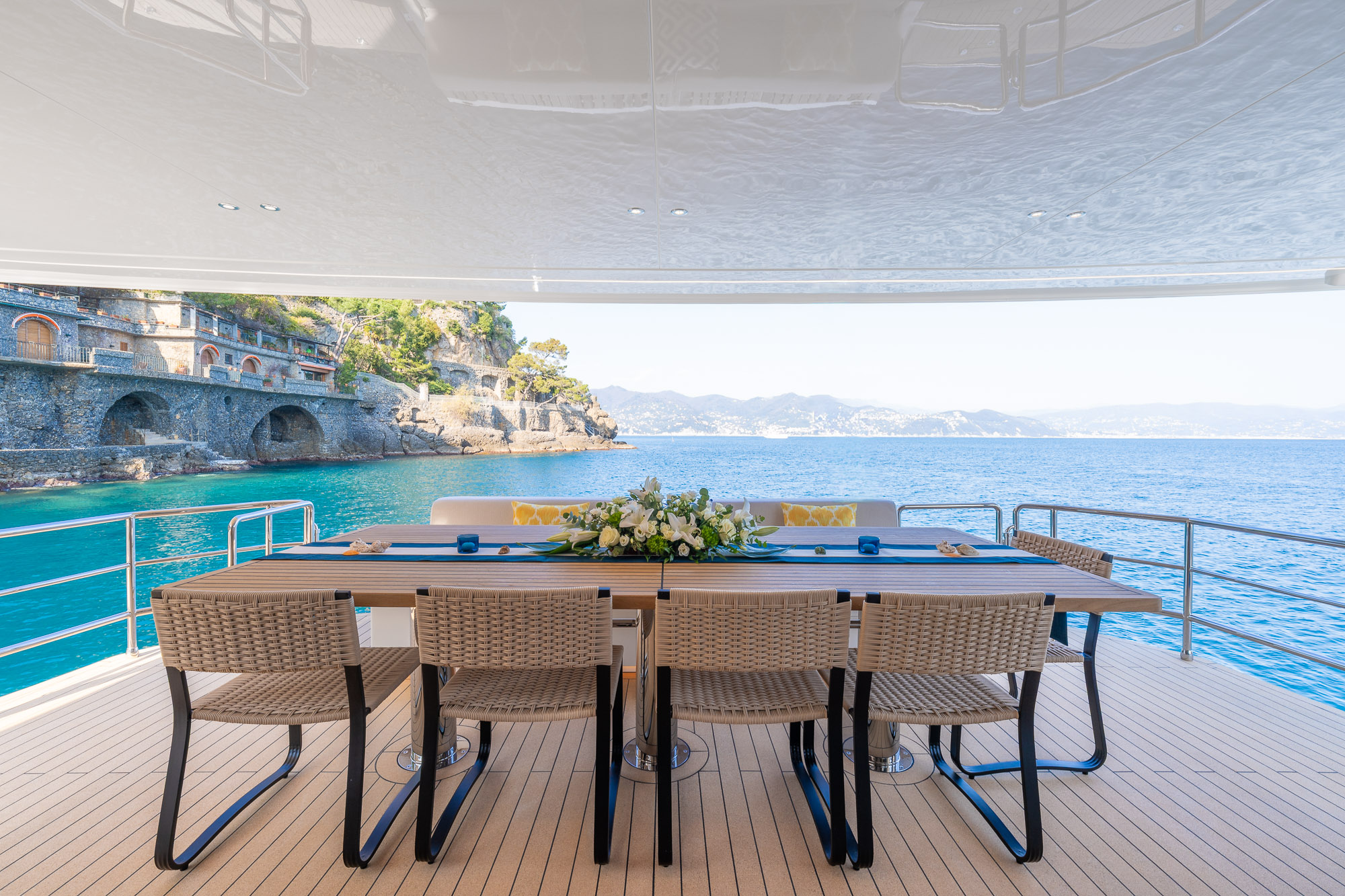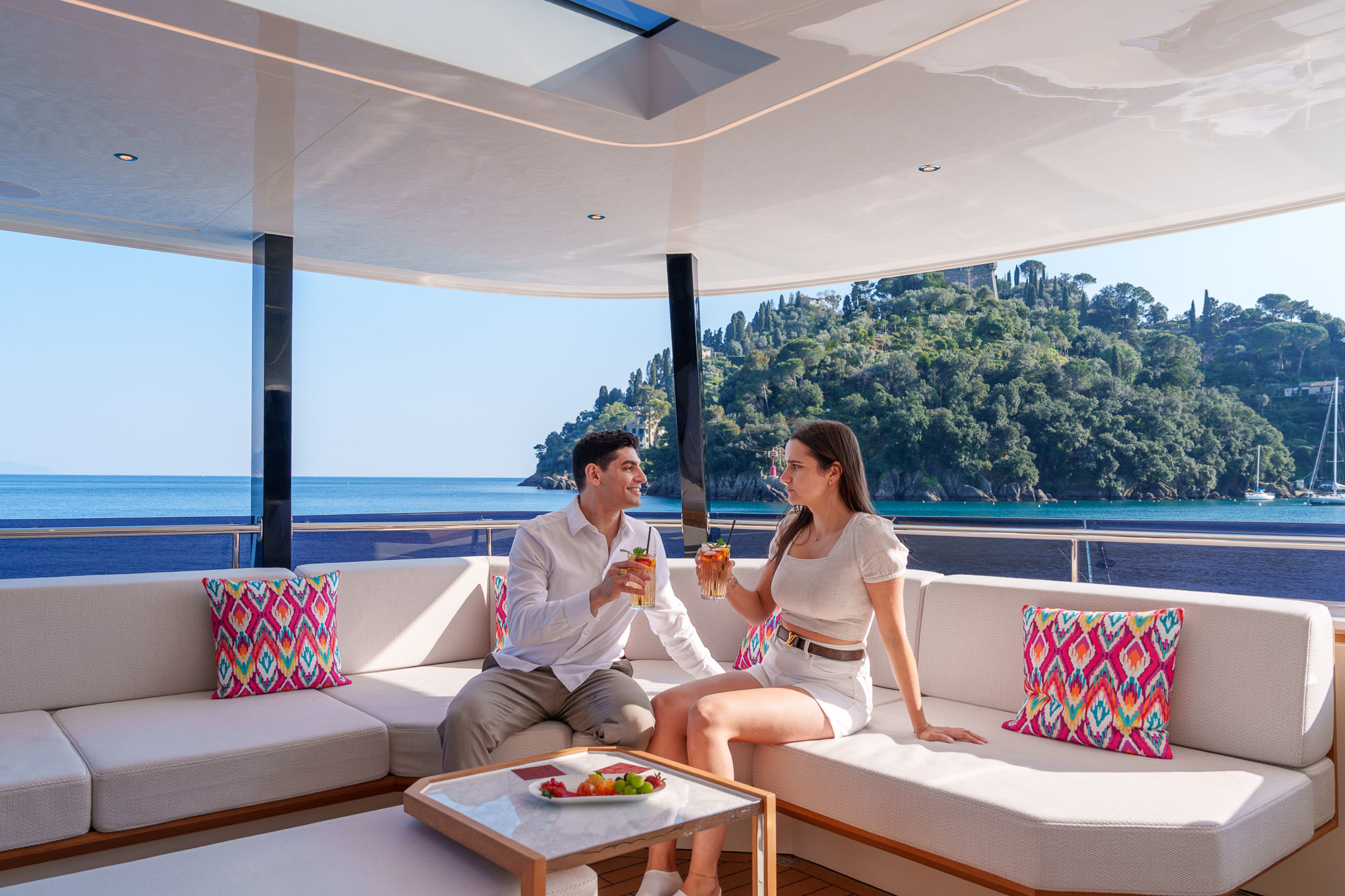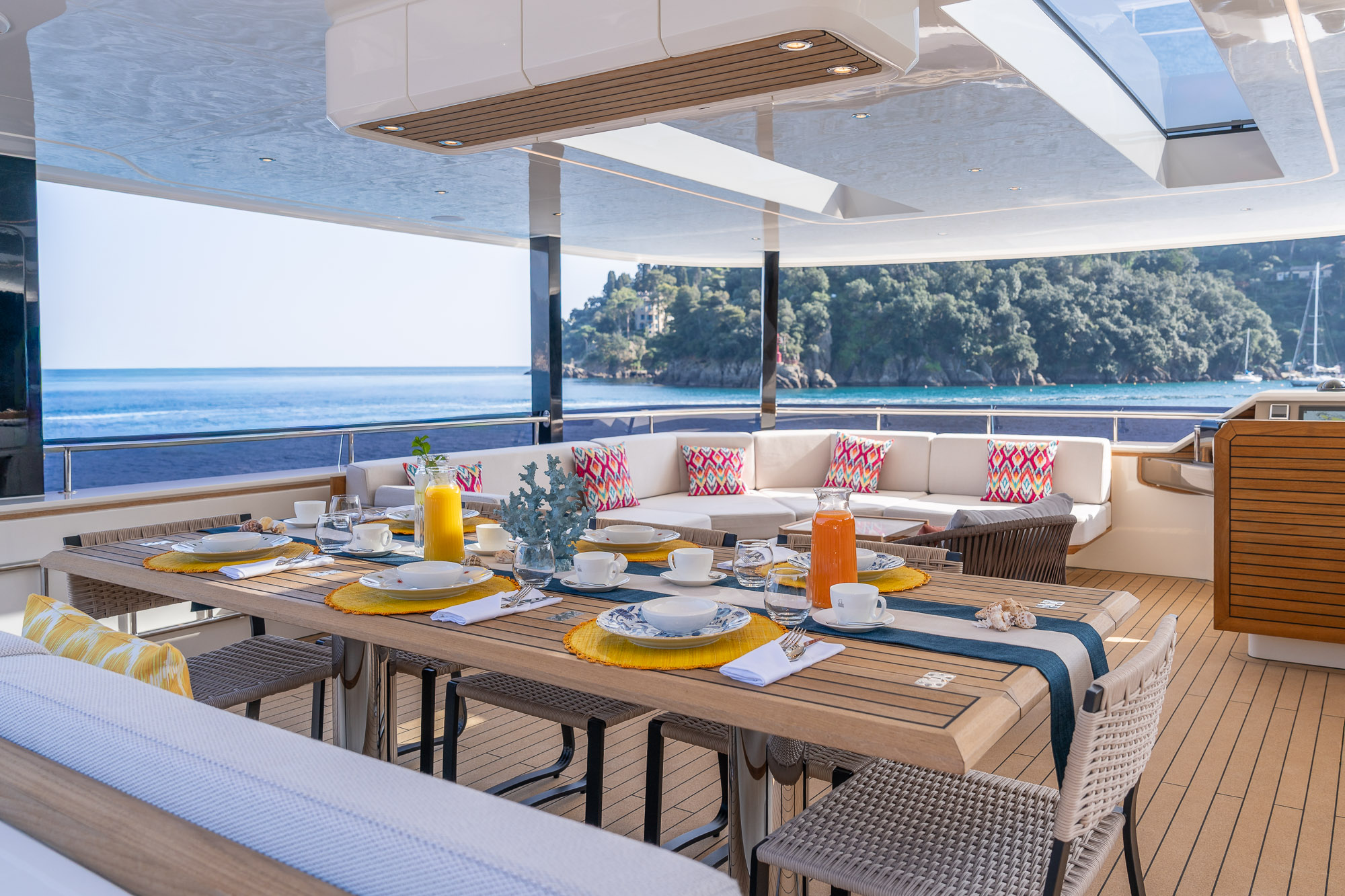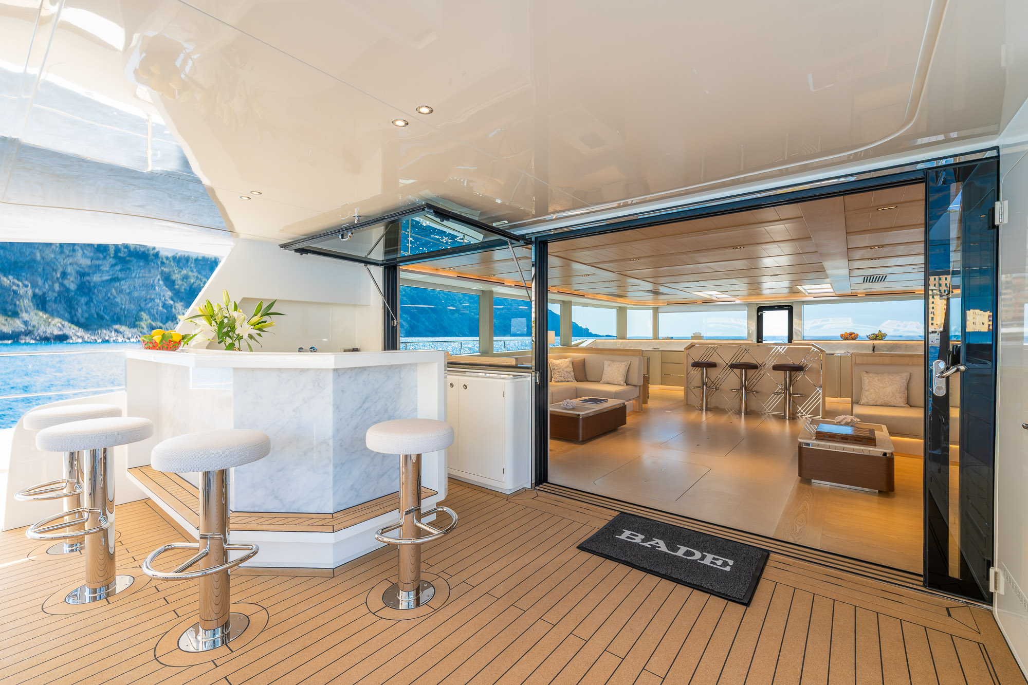 Her outdoor spaces are designed for unforgettable moments: the aft deck for alfresco dining, the bow with adjustable sunbathing pads, the flybridge for panoramic views and socializing, and the swim platform for effortless water access.