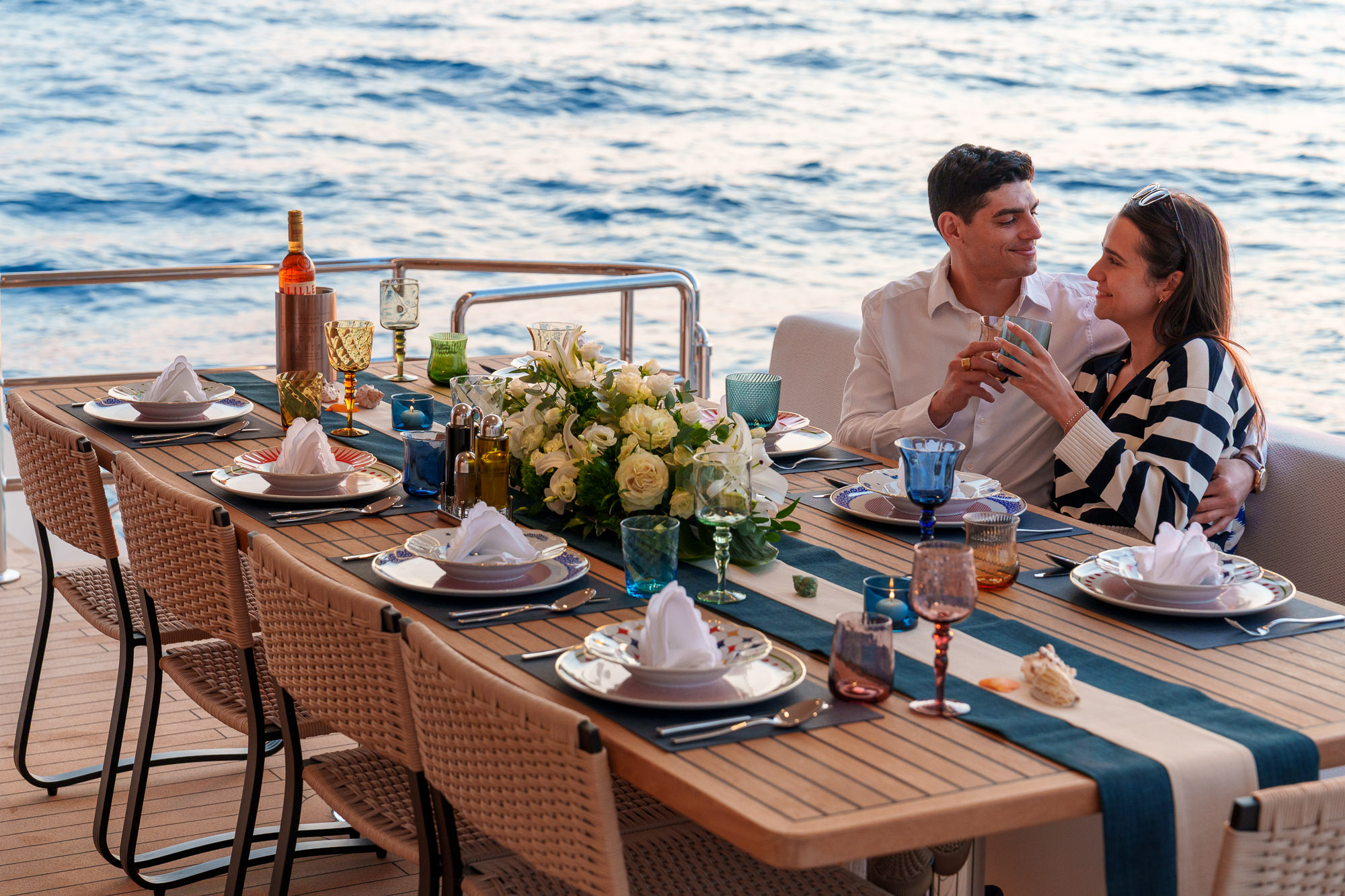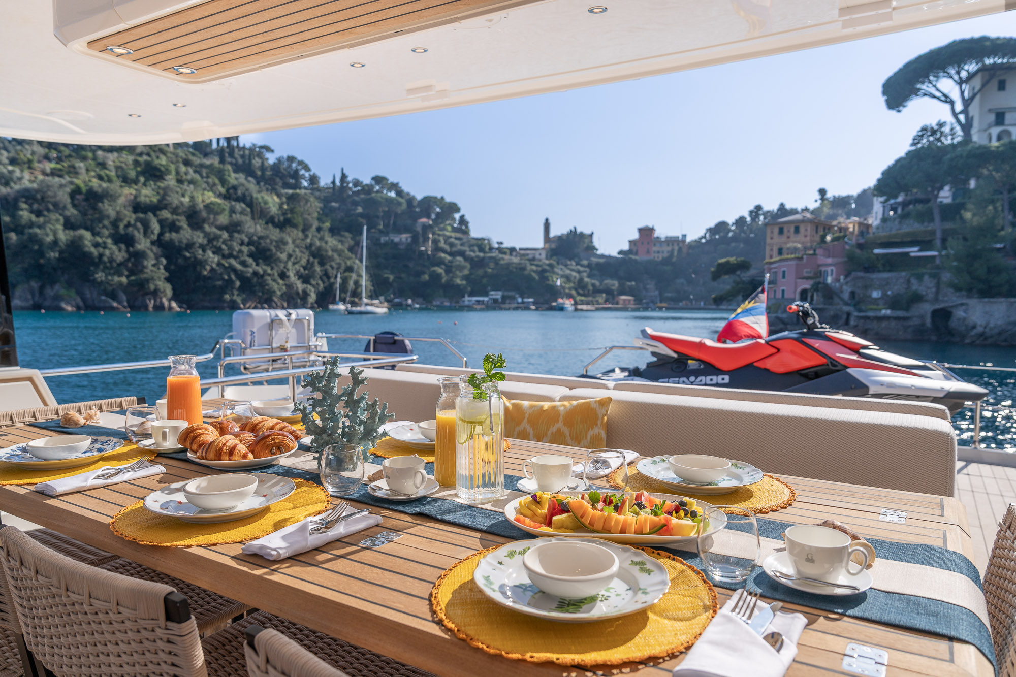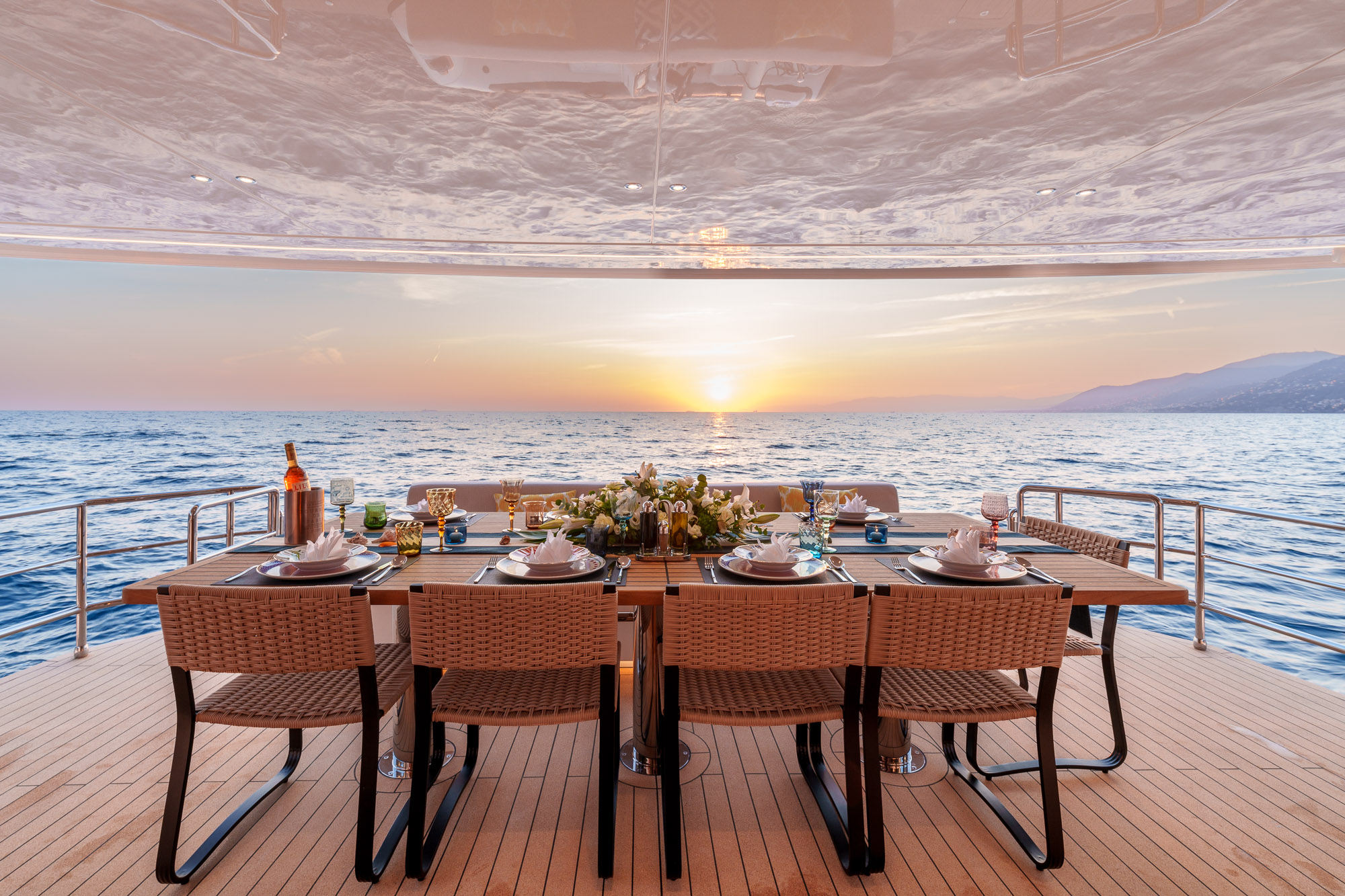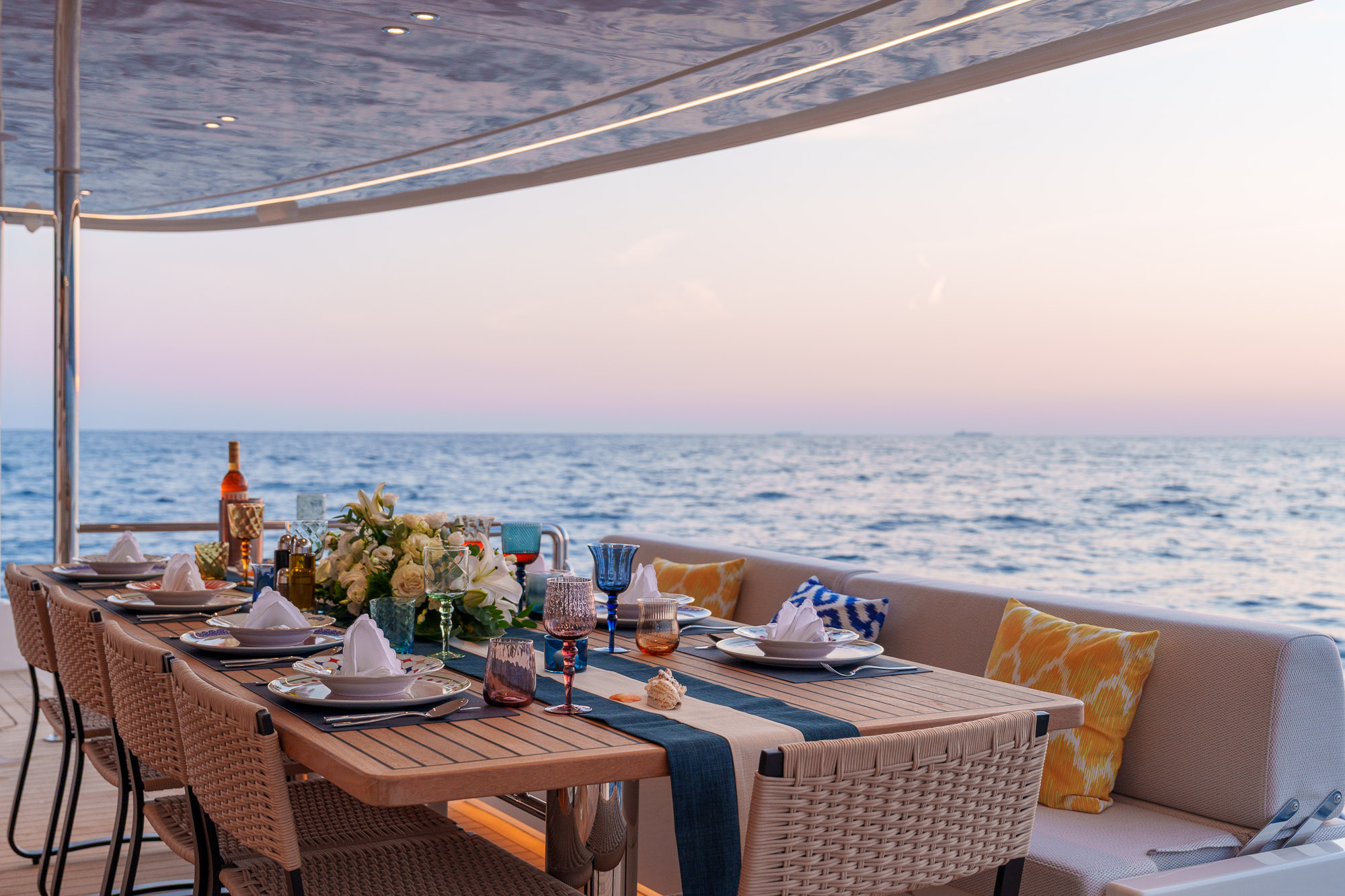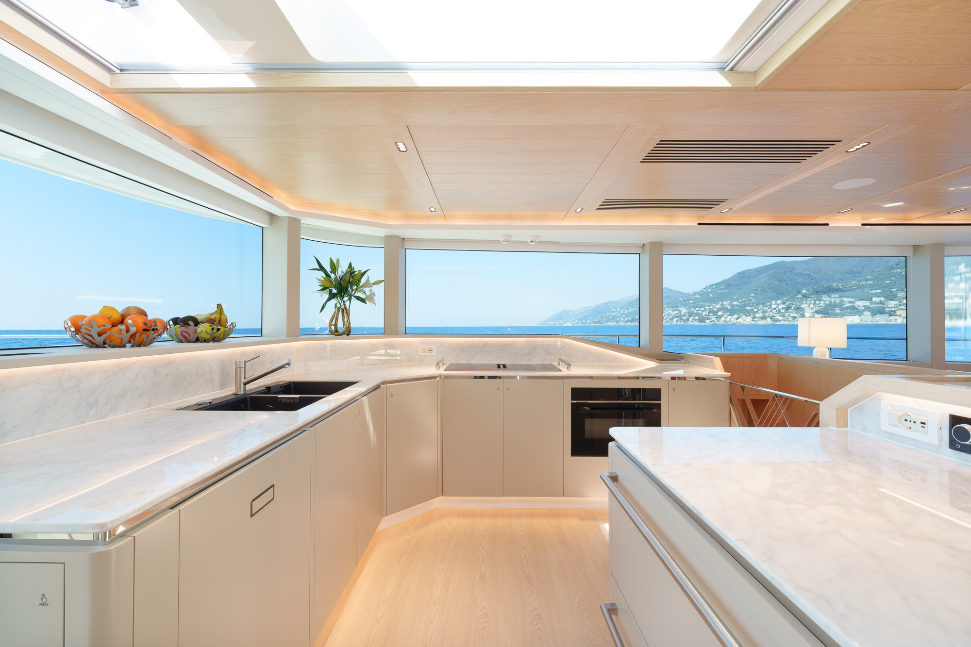Her outdoor spaces are designed for unforgettable moments: the aft deck for alfresco dining, the bow with adjustable sunbathing pads, the flybridge for panoramic views and socializing, and the swim platform for effortless water access.