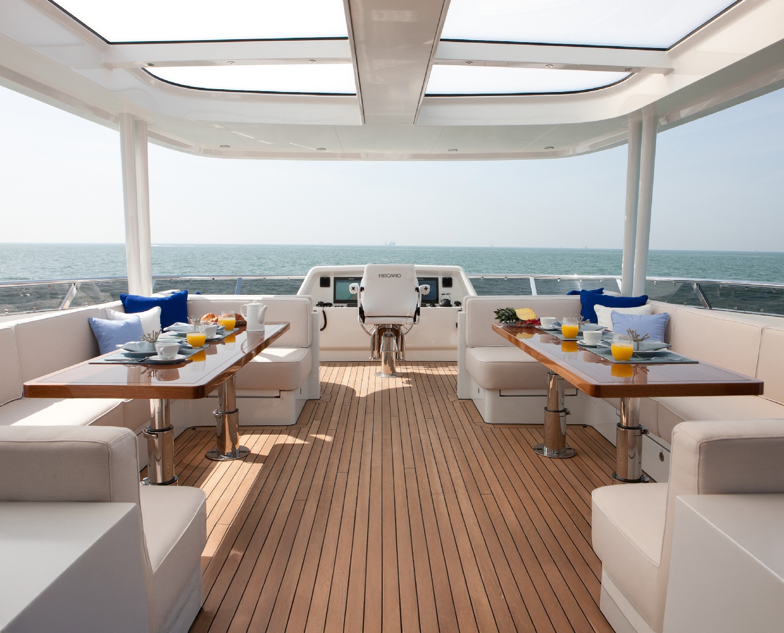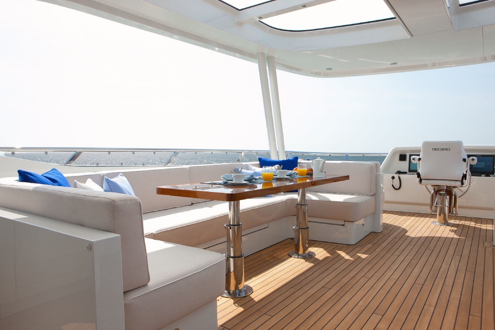 Forward, Firefly has a more intimate dining area on the bow, with a removable sun awning, which is often used when stern to in marinas for guests who would like a little extra privacy. The extremely spacious 85m2 flybridge includes generous seating with tables and a feature bar incorporating a BBQ. The space is designed for relaxation and entertaining, providing plenty of shaded area for al fresco dining.