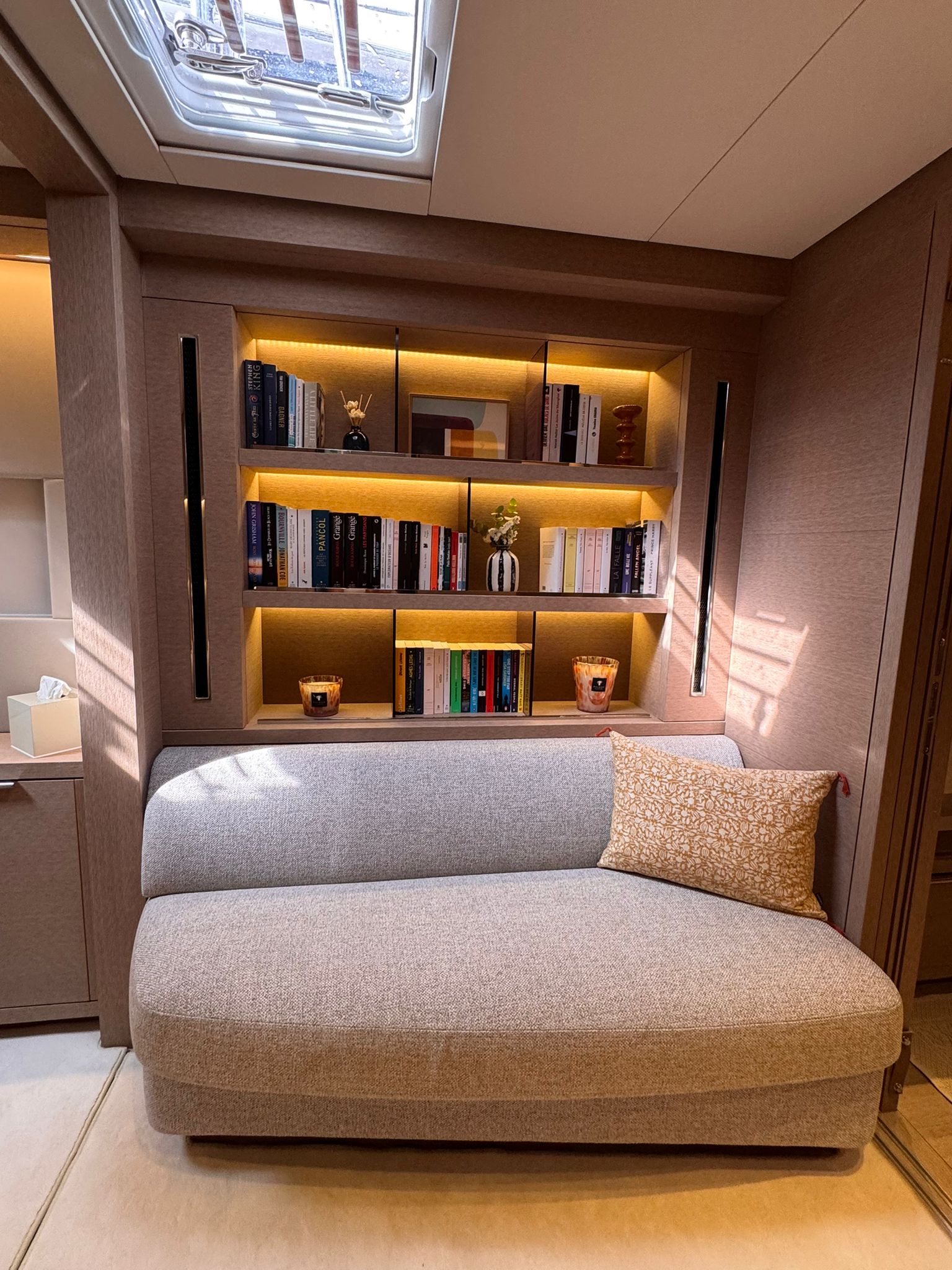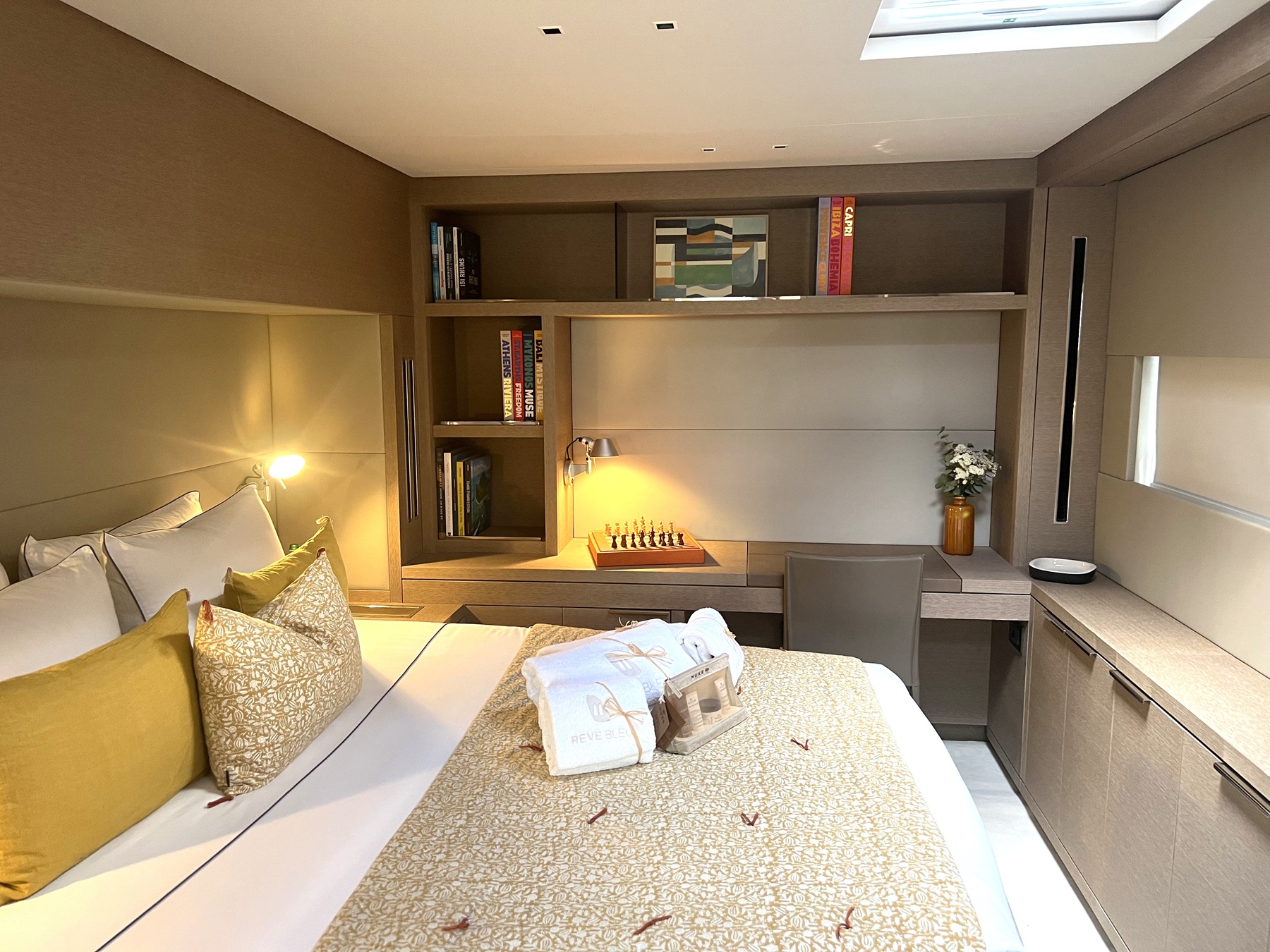 REVE BLEU interior layout sleeps up to 8 guests in 4 staterooms, including a master suite, 2 double cabins and 1 convertible cabin.